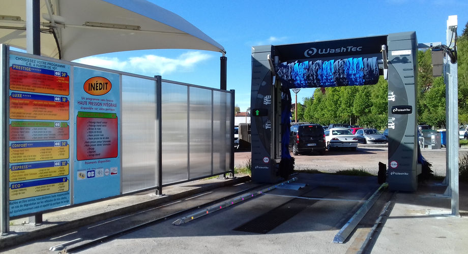 avec entre autres prélavage, rideau de mousse, chimie intensive, haute pression intégrale Turbonozzles, polish, lustrage, séchage intensif.